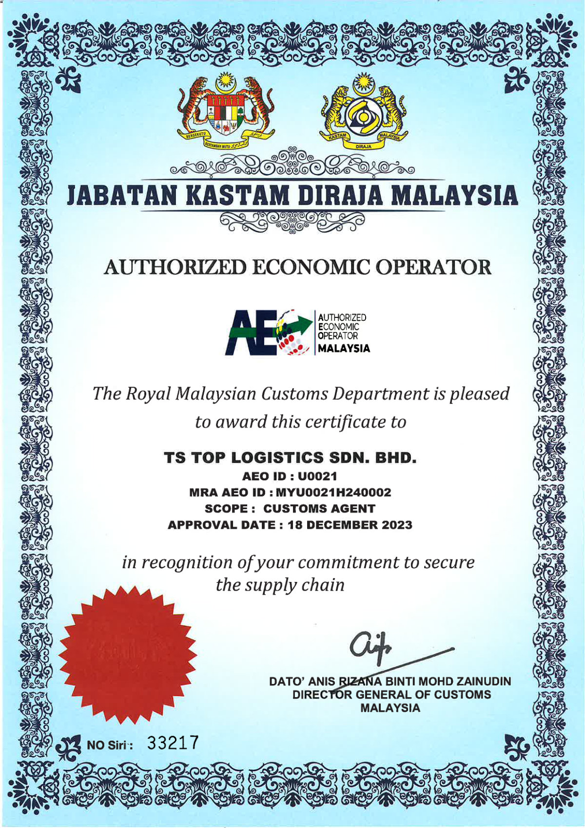 We are proud to announce that our group company, TS Top Logistics Sdn Bhd, has officially been certified as a Malaysian Authorised Economic Operator (AEO) by the Royal Malaysian Customs Department (RMCD) – a recognition that marks a major milestone in our commitment to secure and efficient global trade.